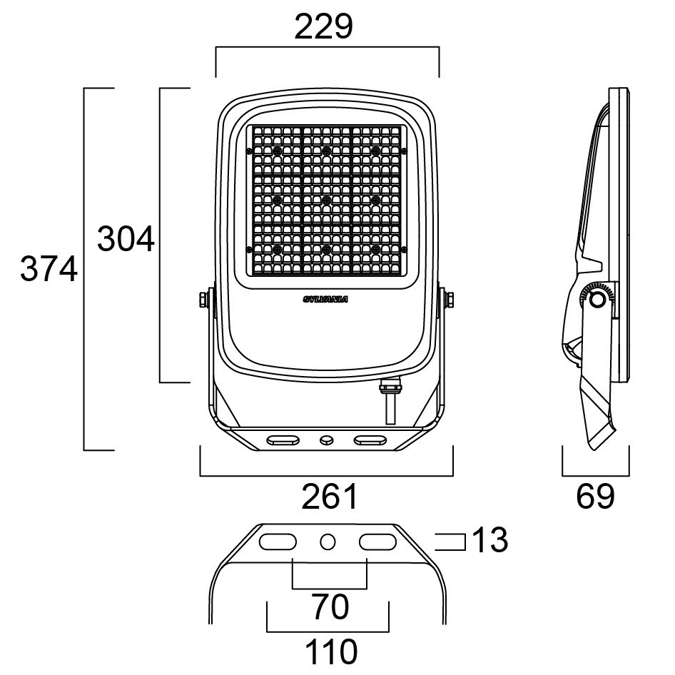 A kültéri LED reflektor 1000 mm-es előre szerelt kábellel (flying lead) és állítható szerelőkonzollal érkezik. Alumínium ház, átlátszó üveg diffúzor, integrált páramentesítő szelep.